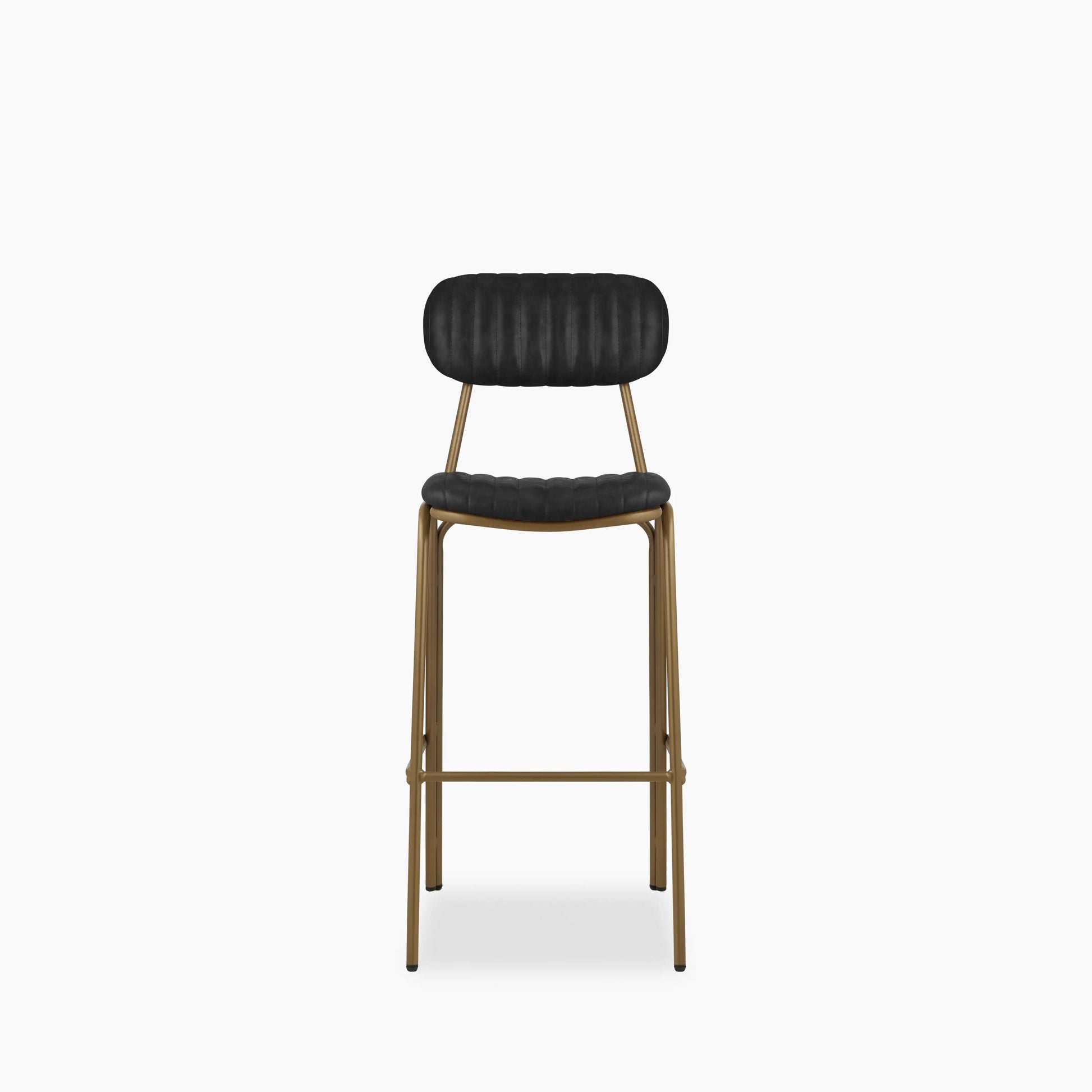 Introducing the Boston Bar Stool; a fresh take on a classic industrial design, this vintage black faux leather upholstered bar stool features a padded seat with a backrest and a brushed antique brass metal frame with a built-in footrest. Upgrade your kitchen breakfast bar or counter area without compromising comfort.