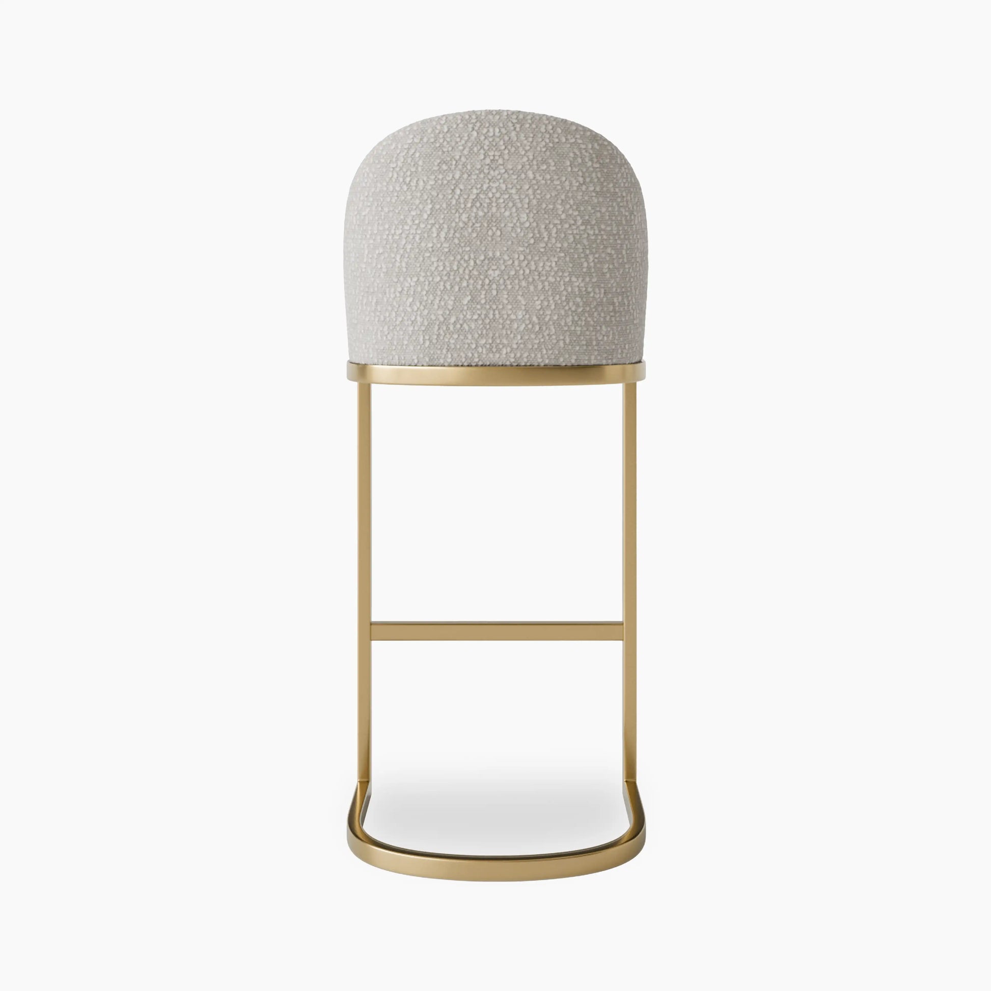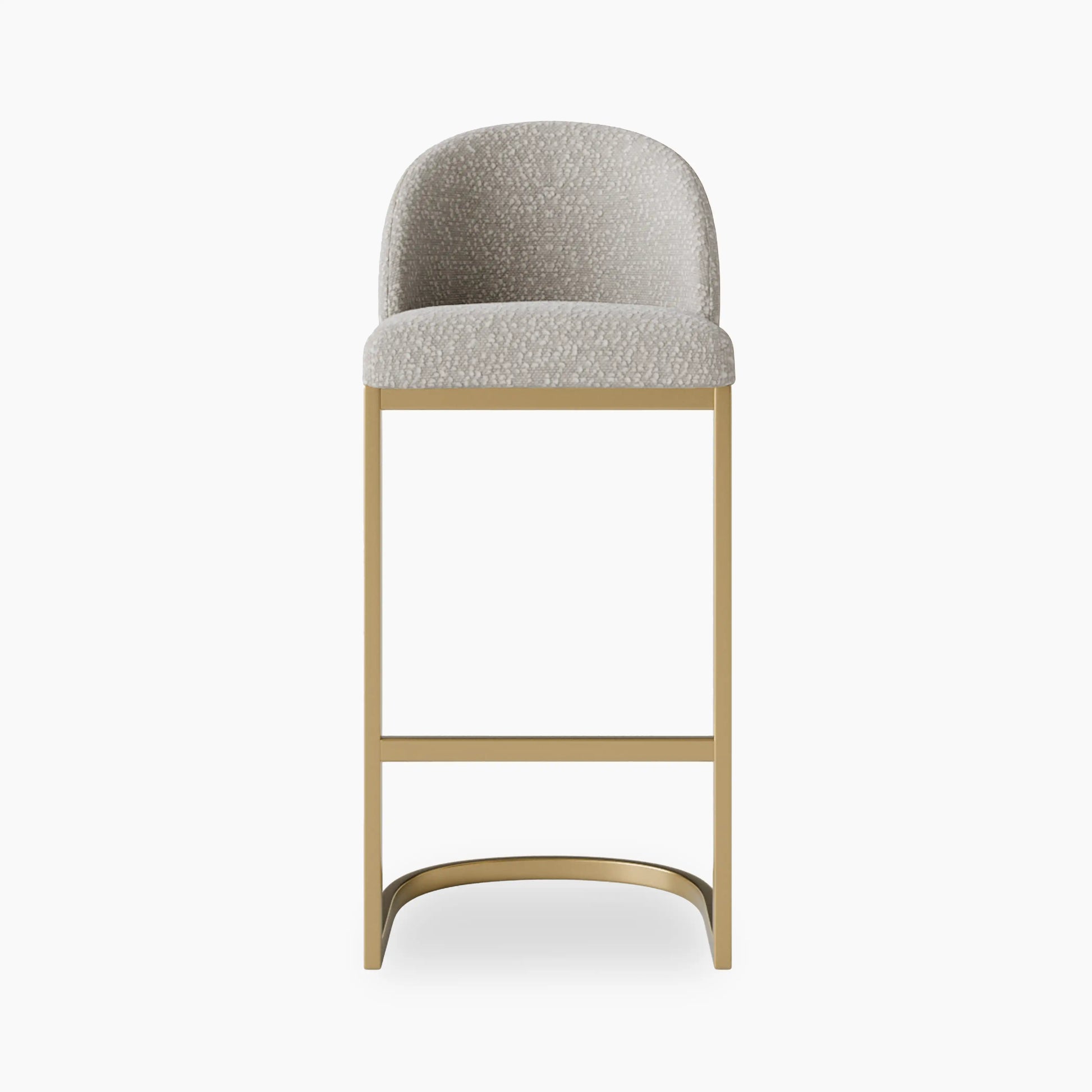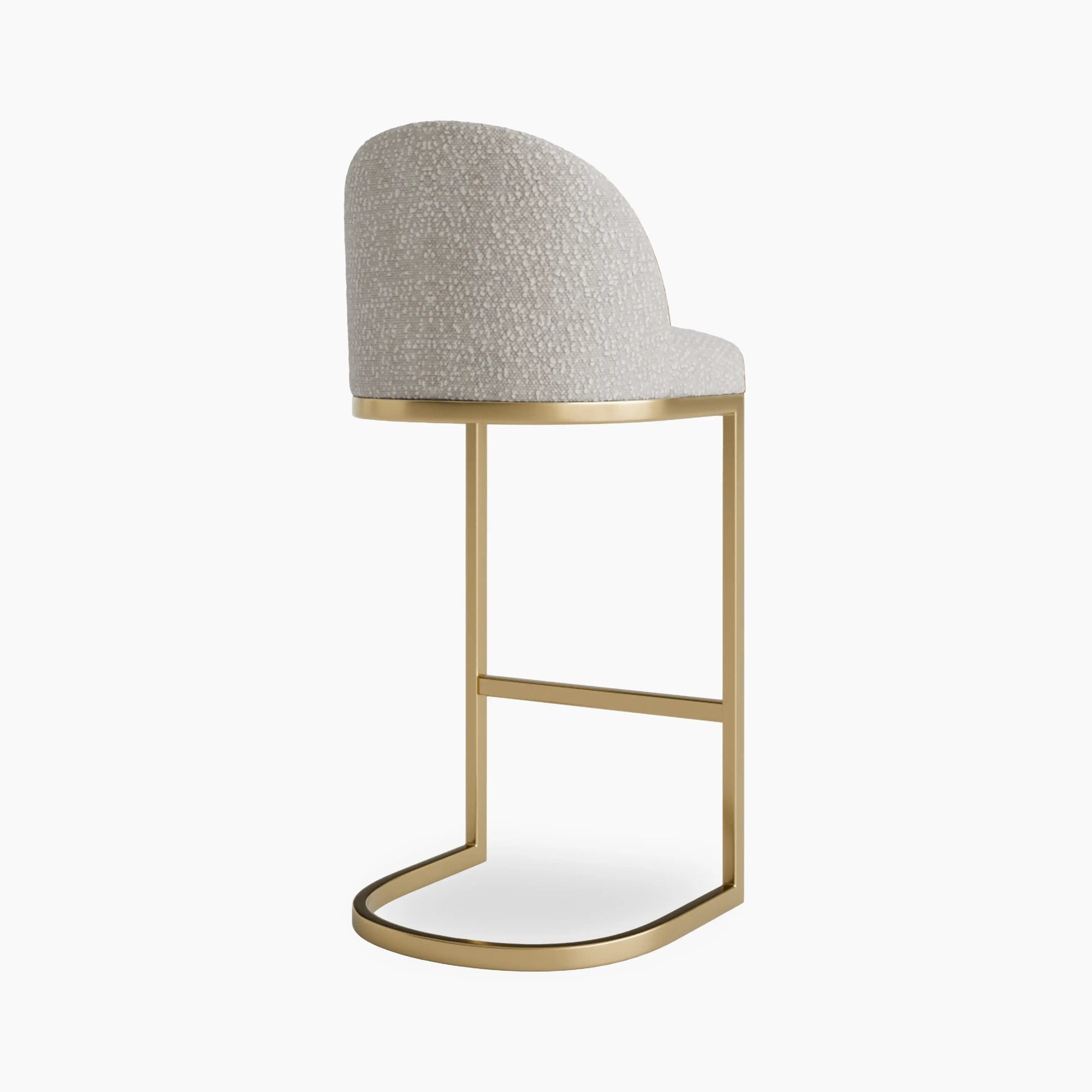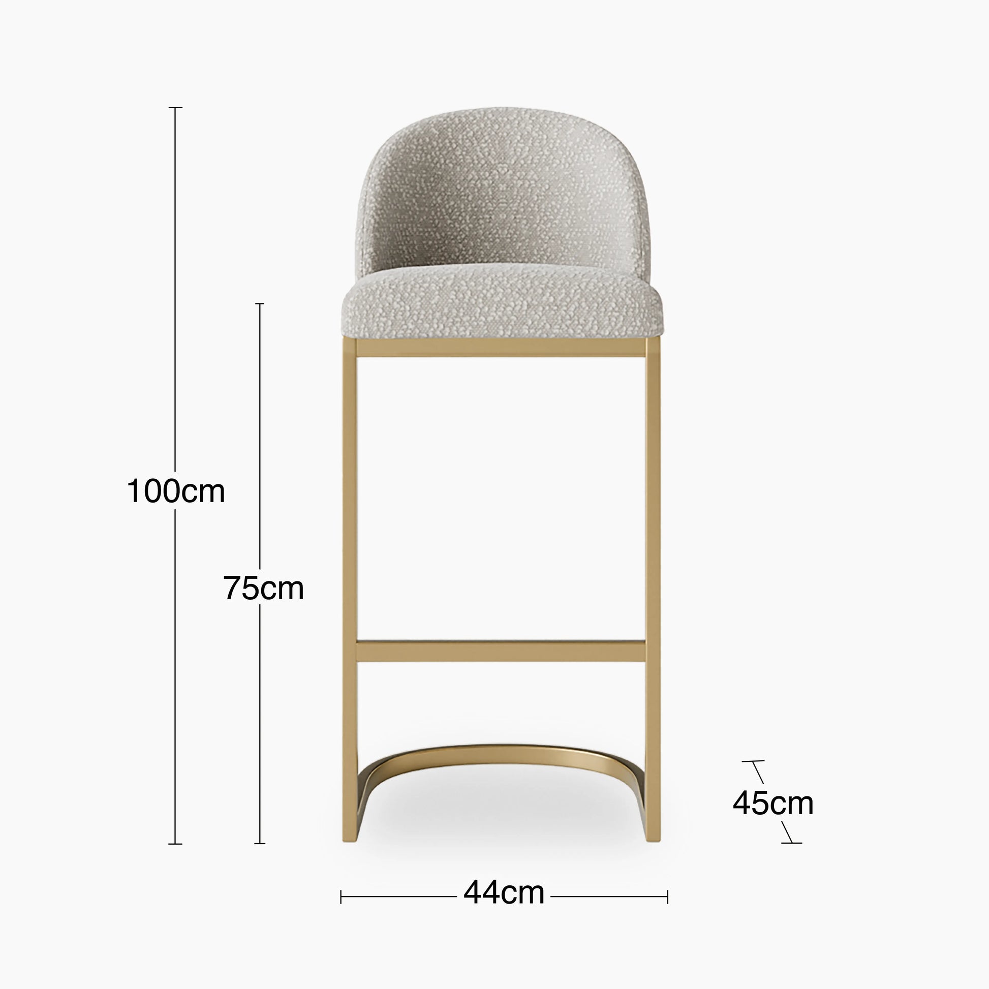 The Matteo Metal Bar Stool in speckled stone brings Art Deco-inspired furniture into your home. The thick brushed brass metal base of the stool is in a curved design with built-in footrest is perfect for perching at the breakfast island or bar. The Matteo range features a padded seat and curved backrest, along with our premium sustainable boucle upholstery, created with sustainability in mind. The result is a contemporary style that adds luxe design without compromising on comfort.For a rich depth of colour and unique softness, the boucle used in this stool is not only of the highest quality but it is made from recycled PET yarns so it is kinder to the environment too.
