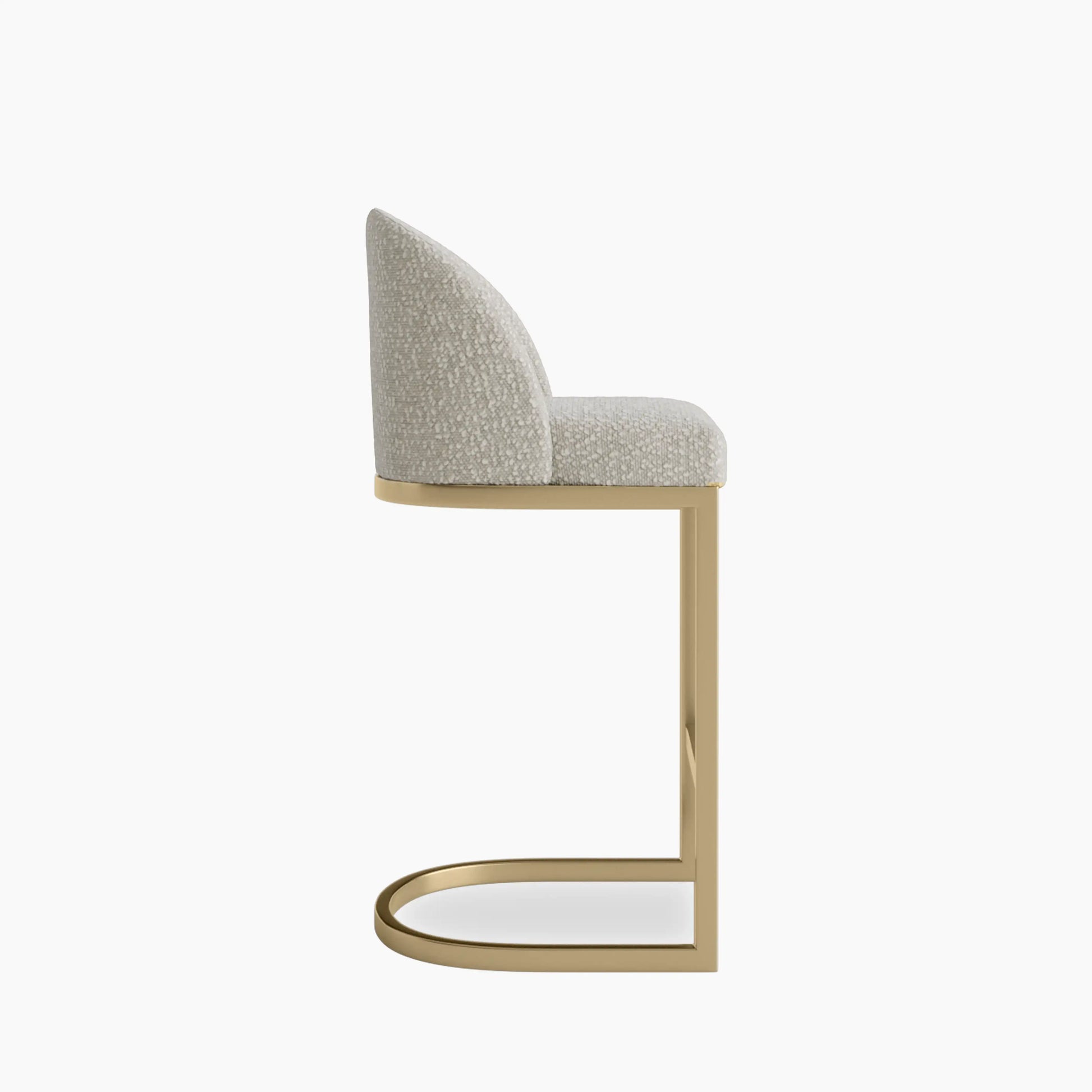 The Matteo Metal Kitchen Stool in speckled stone brings Art Deco-inspired furniture into your home. The thick brushed brass metal base of the stool is in a curved design with built-in footrest is perfect for perching at the breakfast island. The Matteo range features a padded seat and curved backrest, along with our premium sustainable boucle upholstery, created with sustainability in mind. The result is a contemporary style that adds luxe design without compromising on comfort.For a rich depth of colour and unique softness, the boucle used in this stool is not only of the highest quality but it is made from recycled PET yarns so it is kinder to the environment too.