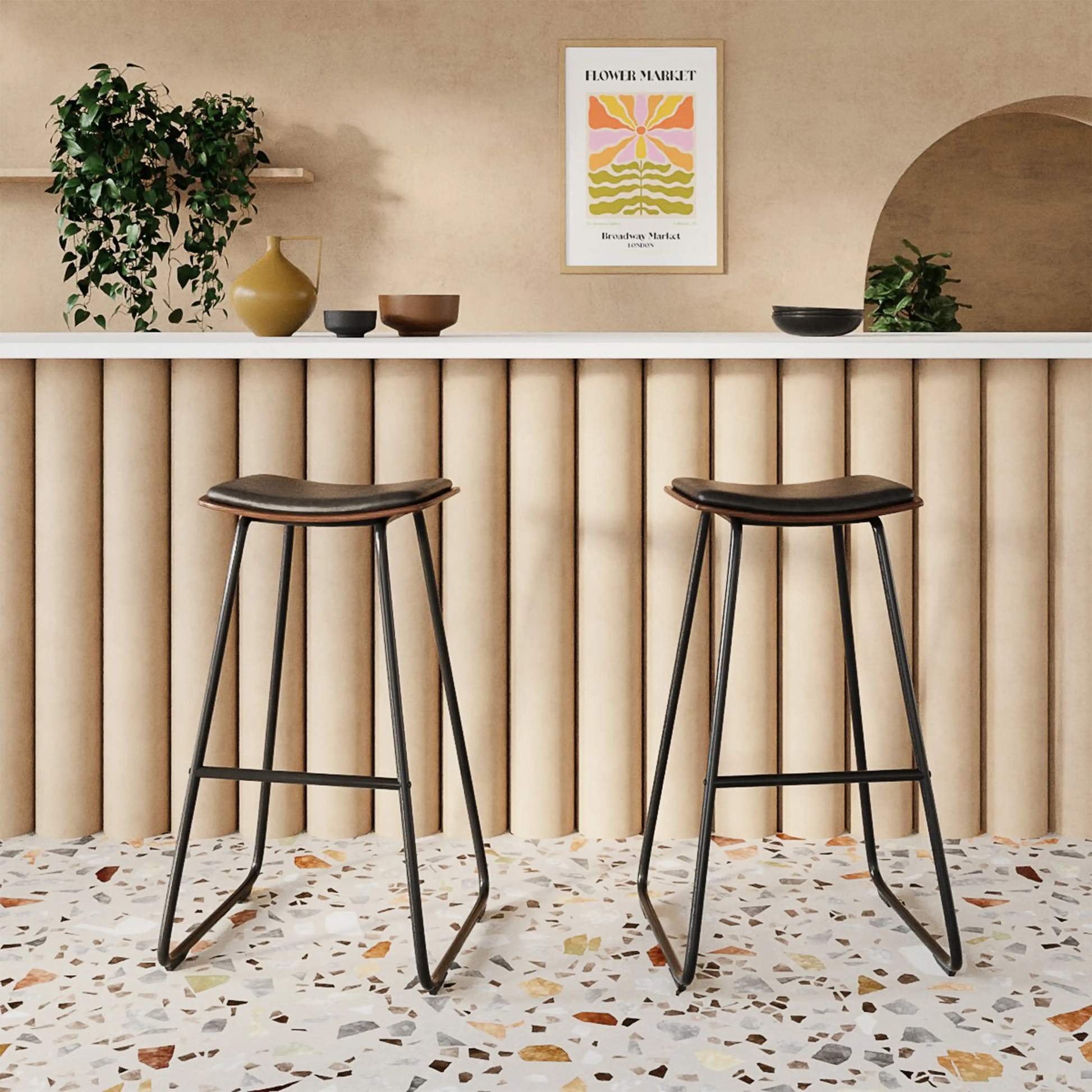 The Slade Bar Stool; inspired by functional design and industrial style. With walnut-stained wooden seat upholstered in black faux leather, curved for comfort around the kitchen island, we love the simplicity of this design. The sleek black metal legs are angled for stability, with footrest, for maximum functionality and a contemporary design for modern kitchens.