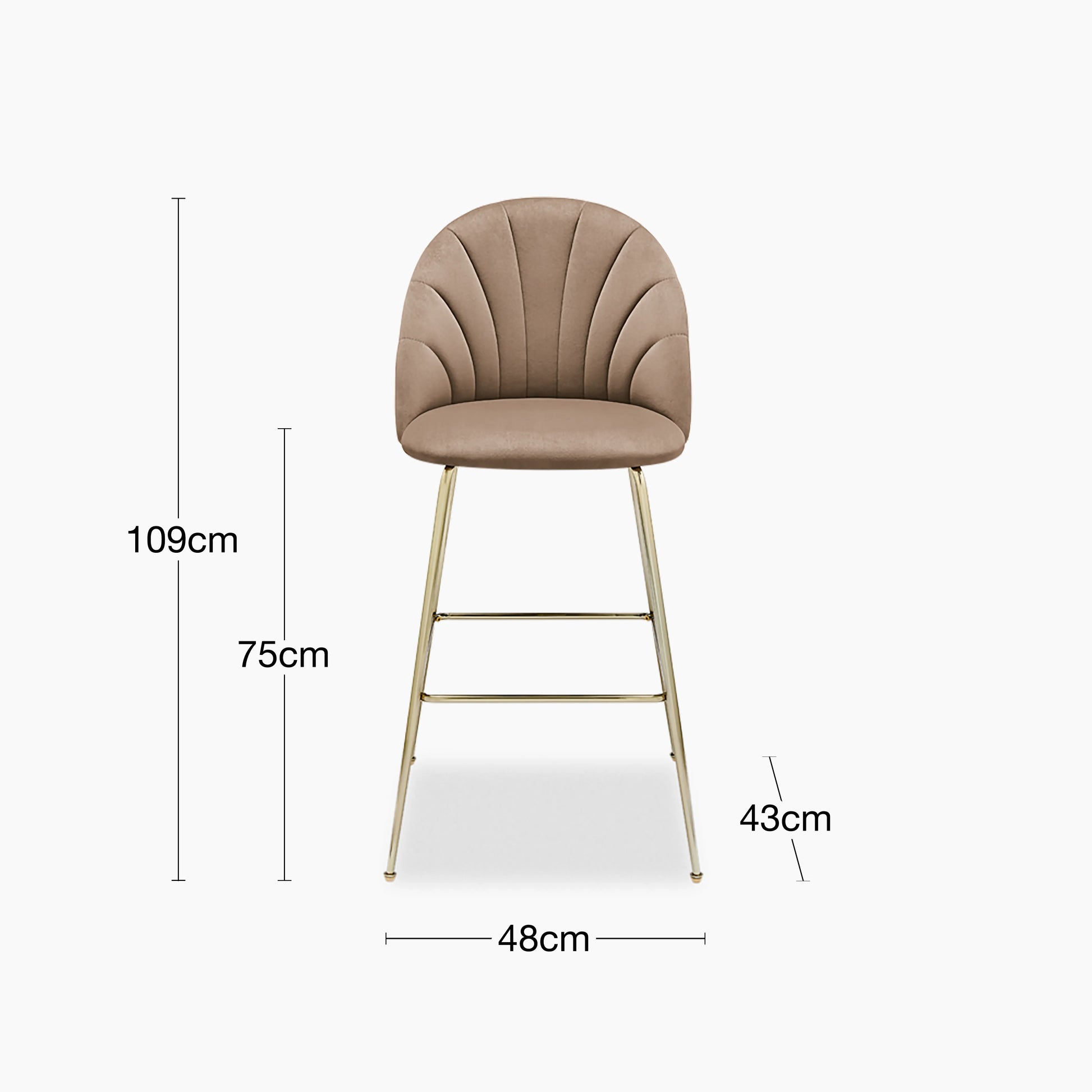 Introducing the Sylvia Art Deco Bar Stool. This design features a comfortable curved back that perfectly shapes the body with a retro fan stitched design. In soft taupe sustainable velvet and metal legs with a built-in footrest for maximum comfort, the Sylvia adds a sleek touch to your bar area.For a rich depth of colour and unique softness, our velvet used in this product is not only of the highest quality but it is made from 100% recycled PET yarns so it is kinder to the environment too.